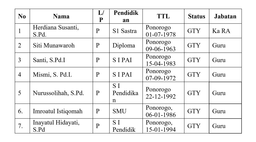 Profil Roudlatul Athfal Al-JawahiriyyahRA Al-Jawahiriyyah berada dibawah naungan Yayasan pendidikan Pesantren Al-Jawahiriyyah. RA ini berdiri tahun 1983, mendapat respon yang baik dari masyarakat. Total murid dalam tiga tahun pelajaran adalah 175 murid. Sayangnya sarana-prasarana terutama bangunan gedung sekolah masih kurang untuk proses pembelajaran. Untuk itu Panitia brmaksud mulai mengumpulkan donasi untuk pembangunan lantai 2 masih sekaligus meneruskan pembangunan sebelumnya. Selengkapnya Profil RA Al-JawahNomor Statstik RAiriyyah dapat dijelaskan sebagai berikut.Identitas SekolahNama SekolahRA Al-Jawahiriyyah Campurejo Sambit PonorogoNIS101235020202NPSN69743996TerakreditasiBNomor Statistik RA101235020202Status AkreditasiSudahProvinsiJawa TimurKabupatenPonorogoDesaCampurejoJalanMajapahit No. 05Kode Pos63474Telp.085230708060Status SekolahSwastaTahun Berdiri1983Kegiatan Belajar-MengajarPagiBangunan SekolahWakafLuas Bangunan96 M2Lokasi SekolahPedesaanJarak ke Pusat Kecamatan3 KMJarak ke Pusat Kota13 KMOrganisasi PenyelenggaraYPP Al-JawahiriyyahData GuruData Siswa Post Views: 74